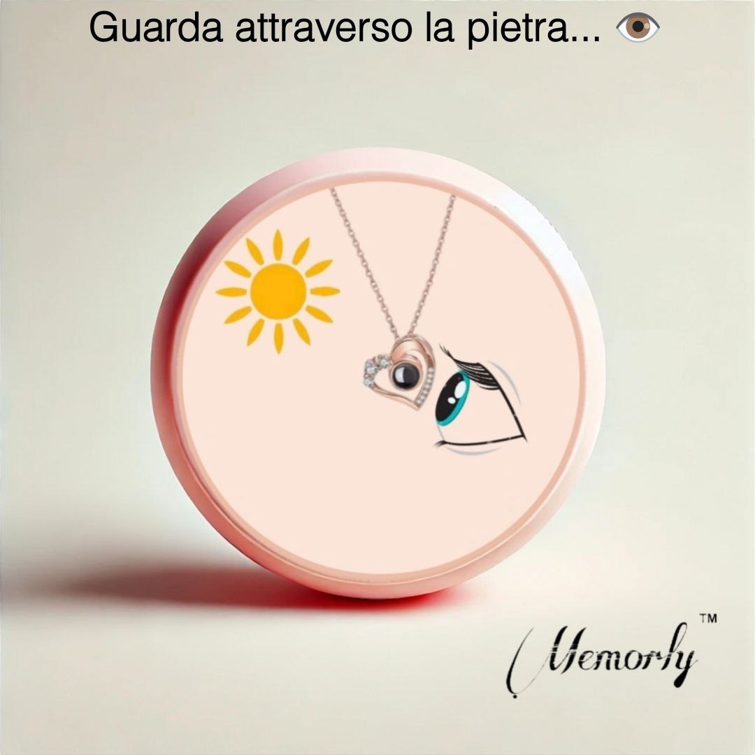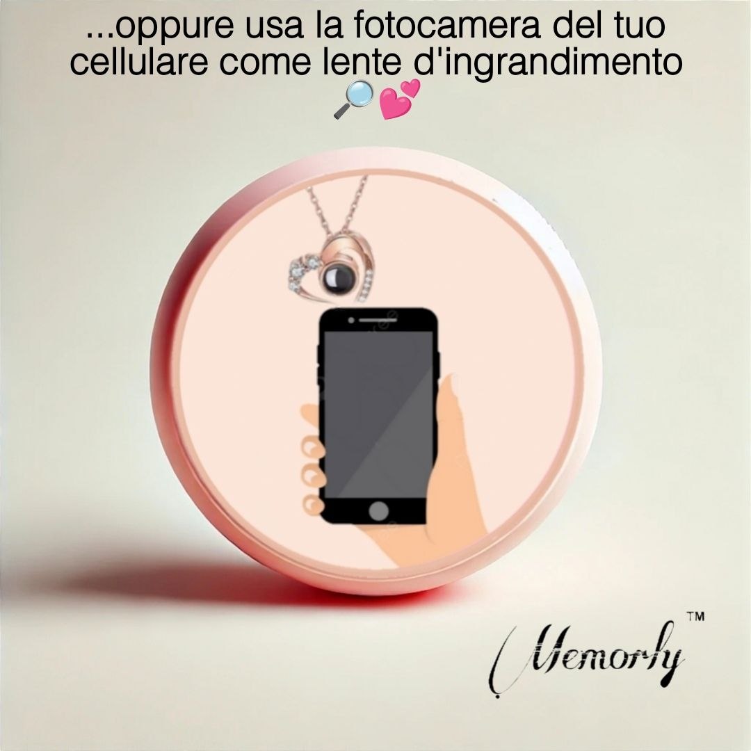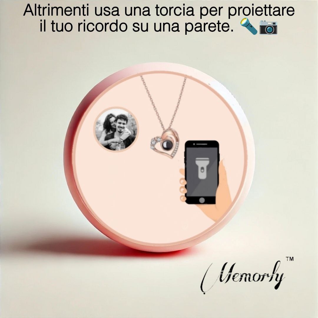 Con la collana proiezione di Memorly™, puoi custodire un momento speciale in un gioiello elegante. Basta un raggio di luce per rivelare la tua foto nascosta!